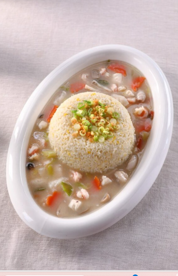 Egg fried rice with sauce of mixed seafood and vegetables.